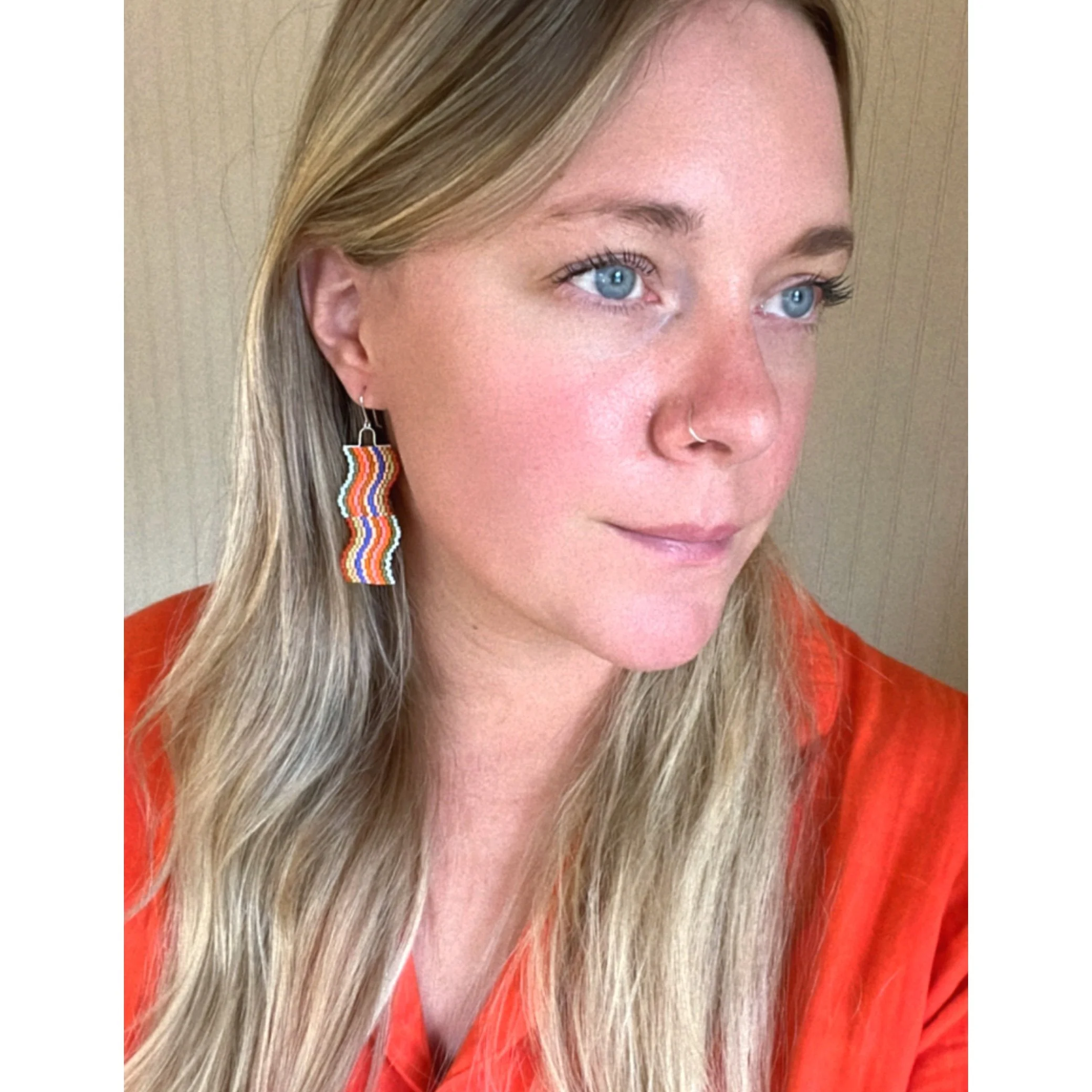 Our earrings are made with glass beads, nylon thread, and 925 sterling silver wire and ear hooks.